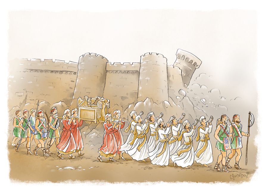 Jéricho était fermée et enfermée à cause des fils d’Israël : nul ne sortait et nul n’entrait. 2 Le SEIGNEUR dit à Josué : « Vois, je t’ai livré Jéricho et son roi, ses vaillants guerriers. 3 Et vous, tous les hommes de guerre, vous tournerez autour de la ville, faisant le tour de la ville une fois ; ainsi feras-tu six jours durant. 4 Sept prêtres porteront les sept cors de bélier devant l’arche. Le septième jour, vous tournerez autour de la ville sept fois, et les prêtres sonneront du cor. 5 Quand retentira la corne de bélier – quand vous entendrez le son du cor –, tout le peuple poussera une grande clameur ; le rempart de la ville tombera sur place, et le peuple montera, chacun droit devant soi. » 6 Josué, fils de Noun, appela les prêtres et leur dit : « Portez l’arche de l’alliance, et que sept prêtres portent sept cors de bélier devant l’arche du SEIGNEUR. » 7 Il dit au peuple : « Passez et faites le tour de la ville, mais que l’avant-garde passe devant l’arche du SEIGNEUR. » 8 Tout se passa comme Josué l’avait dit au peuple : les sept prêtres qui portaient les sept cors de bélier devant le SEIGNEUR passèrent et sonnèrent du cor. L’arche de l’alliance du SEIGNEUR les suivait. 9 L’avant-garde marchait devant les prêtres qui sonnaient du cor et l’arrière-garde suivait l’arche ; on marchait et on sonnait du cor. 10 Josué donna cet ordre au peuple : « Vous ne pousserez pas de clameur, vous ne ferez pas entendre votre voix et aucune parole ne sortira de votre bouche jusqu’au jour où je vous dirai : “Poussez la clameur” ; alors vous pousserez la clameur. »