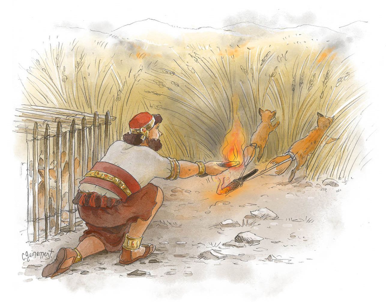 Or, quelque temps après, à l’époque de la moisson des blés, Samson rendit visite à sa femme en apportant un chevreau et déclara : « Je veux entrer chez ma femme, dans la chambre à coucher. » Mais le père de sa femme ne lui permit pas d’entrer 2 et dit à Samson : « Vraiment je me suis dit que tu devais avoir bien de la haine pour elle et je l’ai donnée à ton garçon d’honneur. Mais sa sœur cadette ne vaut-elle pas mieux qu’elle ? Prends-la donc à la place de l’autre ! » 3 Samson leur dit : « Cette fois, je suis quitte envers les Philistins et je vais leur faire du mal. » 4 Samson s’en alla, s’empara de trois cents renards, prit des torches et, tournant les renards queue contre queue, il plaça une torche entre deux queues, au milieu. 5 Puis il mit le feu aux torches et, lâchant les renards dans les moissons des Philistins, il incendia aussi bien les gerbiers que le blé sur pied, et même des vignes et des oliviers.