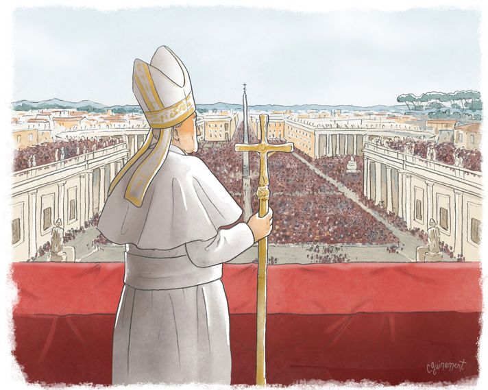 Il est élu pape en 2013, soit après 21 ans d’épiscopat. Il choisit le nom de François, qui n’avait encore jamais été porté par un Pape, en référence à Saint François d’Assise, le saint des pauvres qui nous enseigne le respect profond de toute la création. Sa devise: « Choisi parce que pardonné », évoque la manière dont il a été appelé, tel Matthieu le collecteur d’impôts ou Marie-Madeleine, pécheurs pourtant choisis par le Christ. Il entreprend des réformes au Vatican, cherchant à éviter le « cléricalisme », c’est-à-dire que le clergé et les fidèles soient trop distants, mais aussi que les clerc soient dans une relation de pouvoir avec les fidèles au lieu de l’obligation de service voulue par le Christ. Il continue à rester simple, préférant une vie en communauté à la solitude des appartements du Vatican. Il poursuit son travail d’écriture sur de multiples sujets en rapport avec l’Évangile et le développement humain intégral, fidèle à l’enseignement traditionnel de l’Église, mais avec un regard toujours tourné vers la faiblesse.
