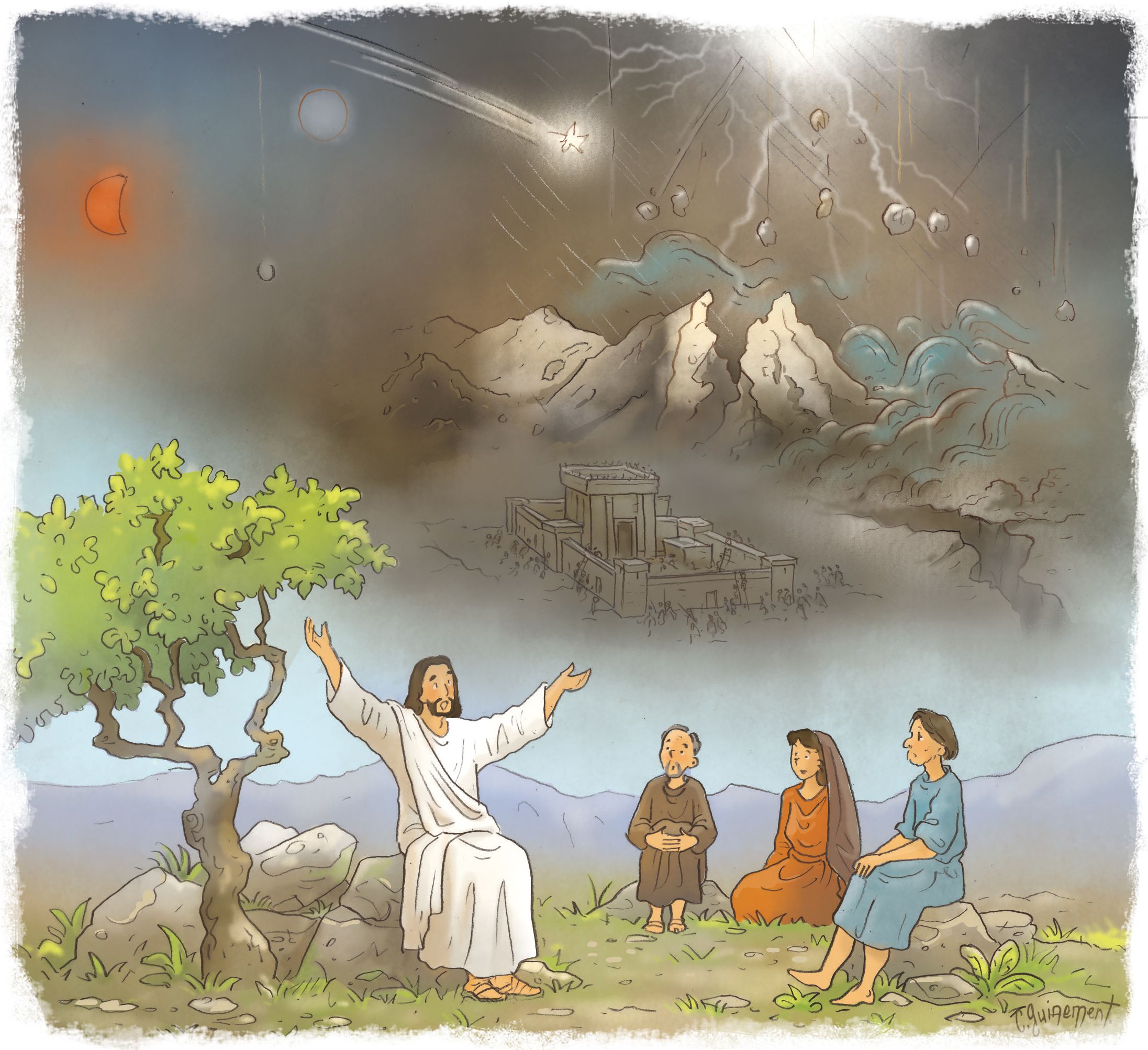 ♦ Séparation et UnitéLe Mont des Oliviers se fendra par le milieu, d'Est en Ouest, changé en une immense vallée... |